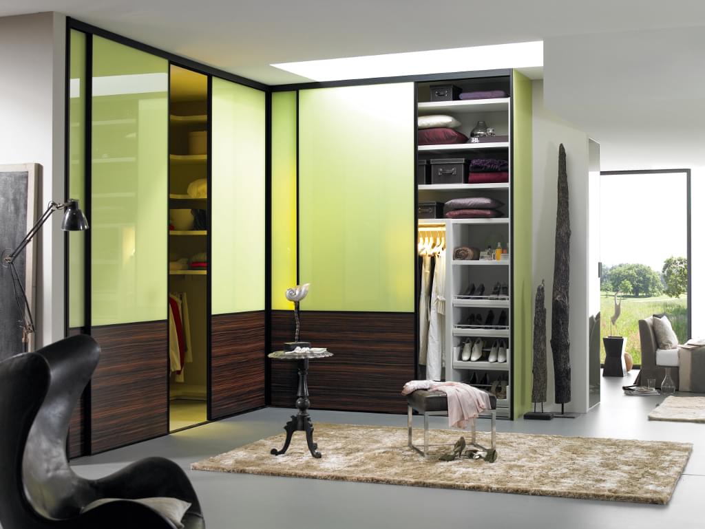In de garderobekast met beweegbare delen komen de deuren bijvoorbeeld samen in een hoek van 90 graden. Hierdoor is de gehele hoek als opslagruimte te benutten. CABINET maakt persoonlijke dromen waar. Bijvoorbeeld met schuifdeurdessins in meer dan tienduizend kleuren en een breed scala van mogelijkheden (bedrukt, behangen, met stof bekleed etc.). De foto’s tonen de LINEA-schuifdeur in zwart, gecombineerd met een glazen gedeelte dat is gelakt in limoen. In het onderste gedeelte van de deur zijn elegante, kwalitatief hoogstaande houten accenten verwerkt. De schuifdeuren sluiten door middel van een magneet, zodat ze precies in de hoek sluiten.