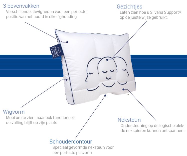 Veel mensen hebben last van nekklachten. Dit kan verschillende oorzaken hebben. Een hoofdkussen dat niet de juiste ondersteuning biedt, kan één van de boosdoeners zijn. Om deze reden introduceerde Silvana al ruim 40 jaar geleden de Silvana Support serie. Een concept dat zijn waarde heeft bewezen. Want aan Silvana Support®, het kussen met neksteun, geven meer mensen de voorkeur dan aan enig ander hoofdkussen.