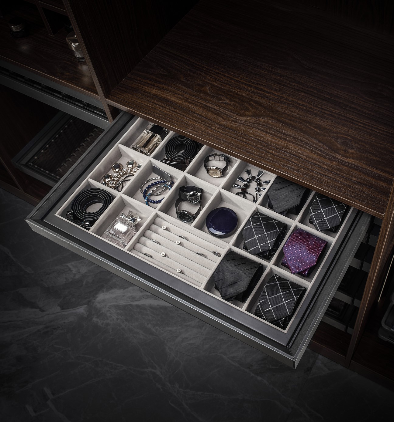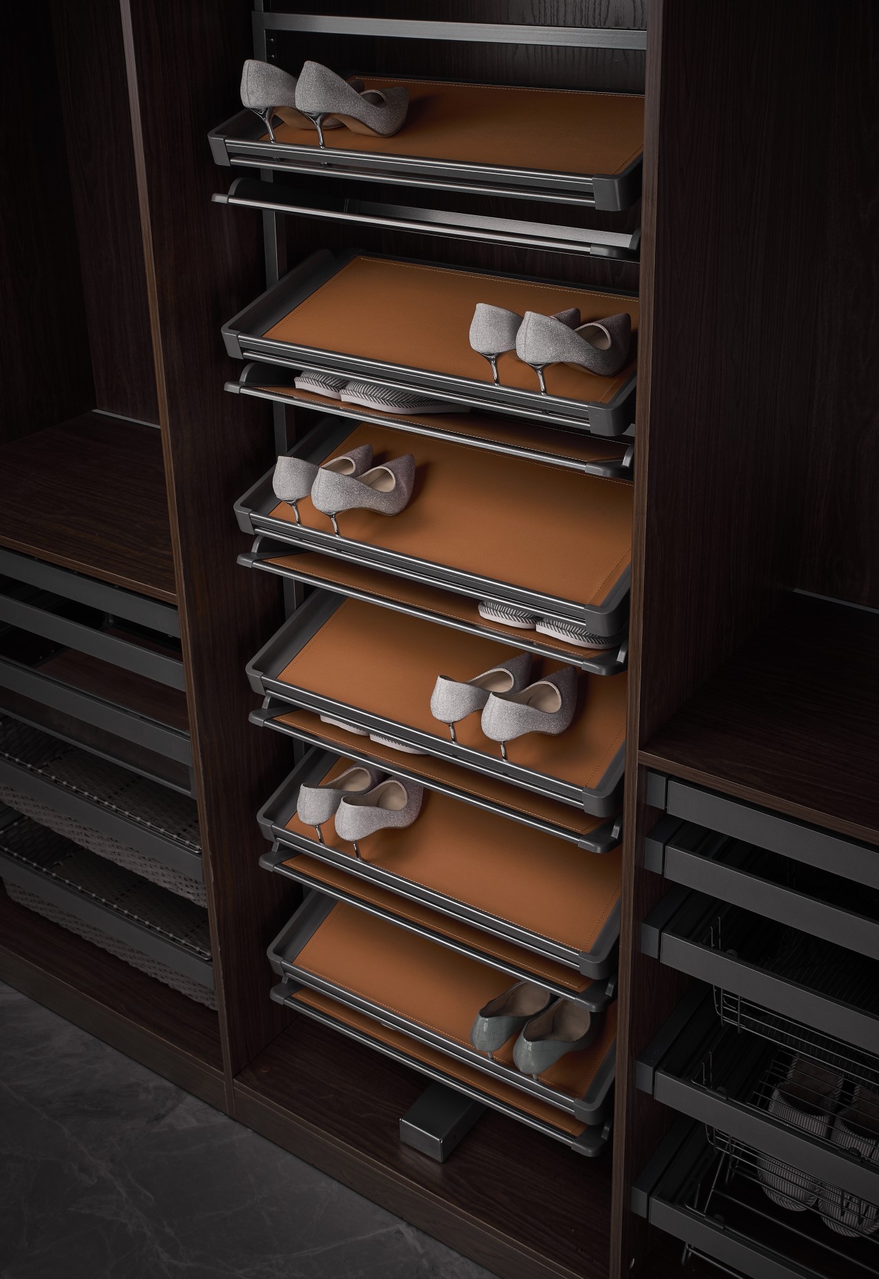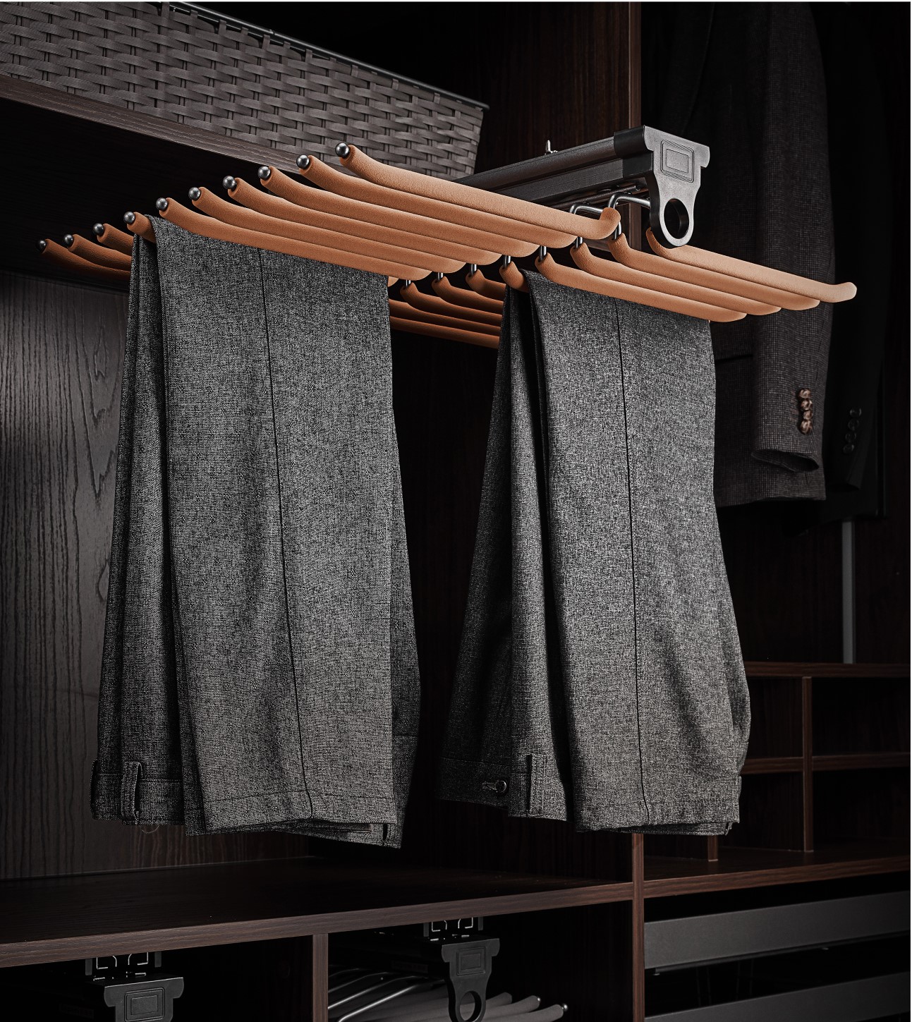 Een serie van fraaie en handige kastaccessoires in antraciet/grijs en antraciet/oranje voor een extra luxe uitstraling van je kledingkast of garderobe.