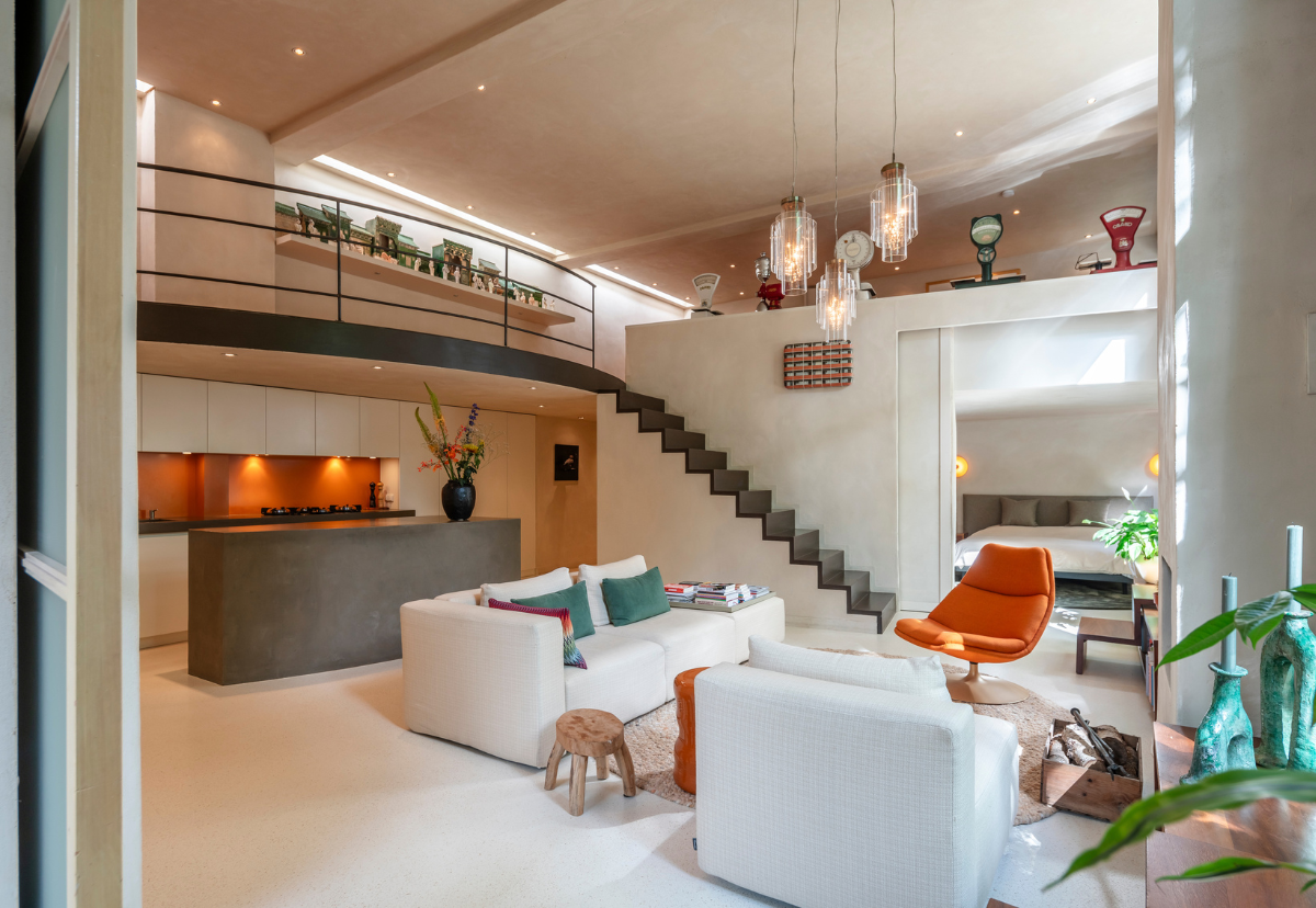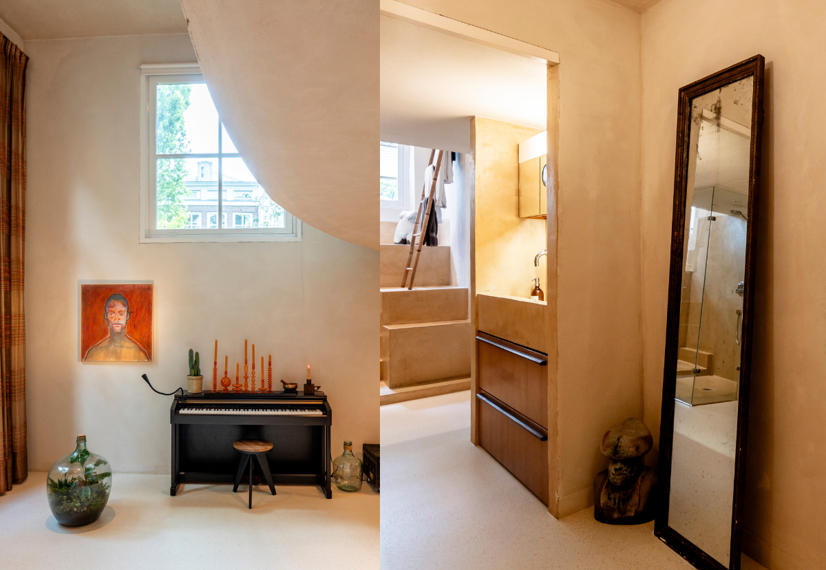 In een grachtenpand in Amsterdam is een terrazzo gietvloer aangebracht in de hele woning. De bestaande PU gietvloer, die slijtage vertoonde, is vervangen door de Motion Terrazzo gietvloer. De vloer is strak afgewerkt zonder plinten, waarbij de marmerkorrels handmatig zijn geschuurd voor een nette aansluiting op de wand.