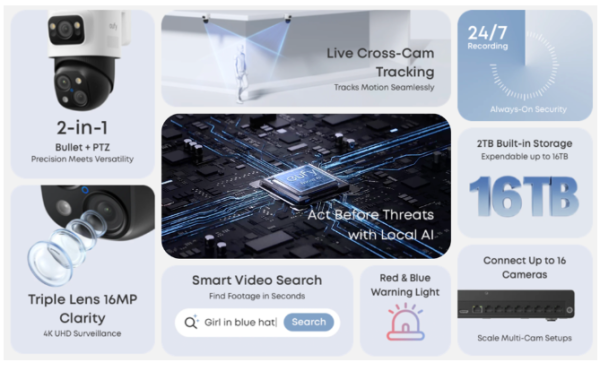 Slimme netwerkvideorecorder met veel opslagruimte De kern van het nieuwe beveiligingscamerasysteem is de speciaal ontwikkelde EdgeAICore, een krachtige NVR (Network Video Recorder) met een geïntegreerde grafische kaart die videobeelden analyseert, objecten volgt en dreigingen ter plekke in realtime detecteert. Dit detecteren gebeurt zonder externe servers. Alle gegevens blijven dus in handen van de gebruiker, versleuteld volgens de hoogste beveiligingsstandaarden, lokaal opgeslagen en op elk moment toegankelijk. Er is maar liefst 2 terabyte aan opslagruimte beschikbaar, zodat de gegevens altijd gemakkelijk kunnen worden opgeslagen en opgehaald. Indien gewenst is het systeem eenvoudig uit te breiden tot 16 terabyte. Met zoveel gegevens kan het al snel moeilijk worden om overzicht te bewaren. Daarom gebruikt de slimme zoekfunctie trefwoorden zoals ‘fiets’, ‘leverancier’ of ‘zwarte auto’ om eenvoudig de juiste opname te vinden.
