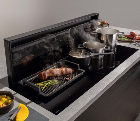Functionaliteit en stijl worden gecombineerd in deze werkbladafzuiging. De afzuigkap achteraan de kookplaat is verstelbaar in hoogte en afgewerkt in glas.