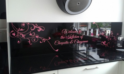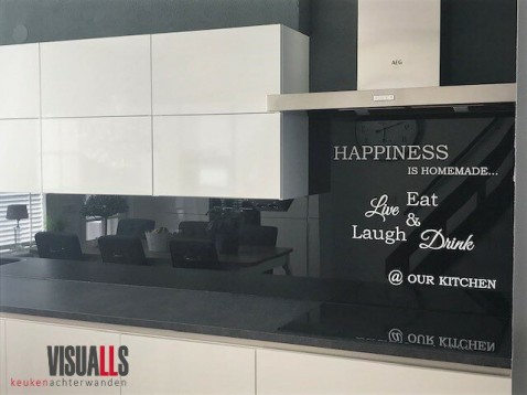 Speciale keukenachterwanden met (eigen-)tekst. Thermisch gehard glas kan direct achter de kookplaat en is leverbaar in alle RAL-kleuren. Uniek product van Visualls.nl