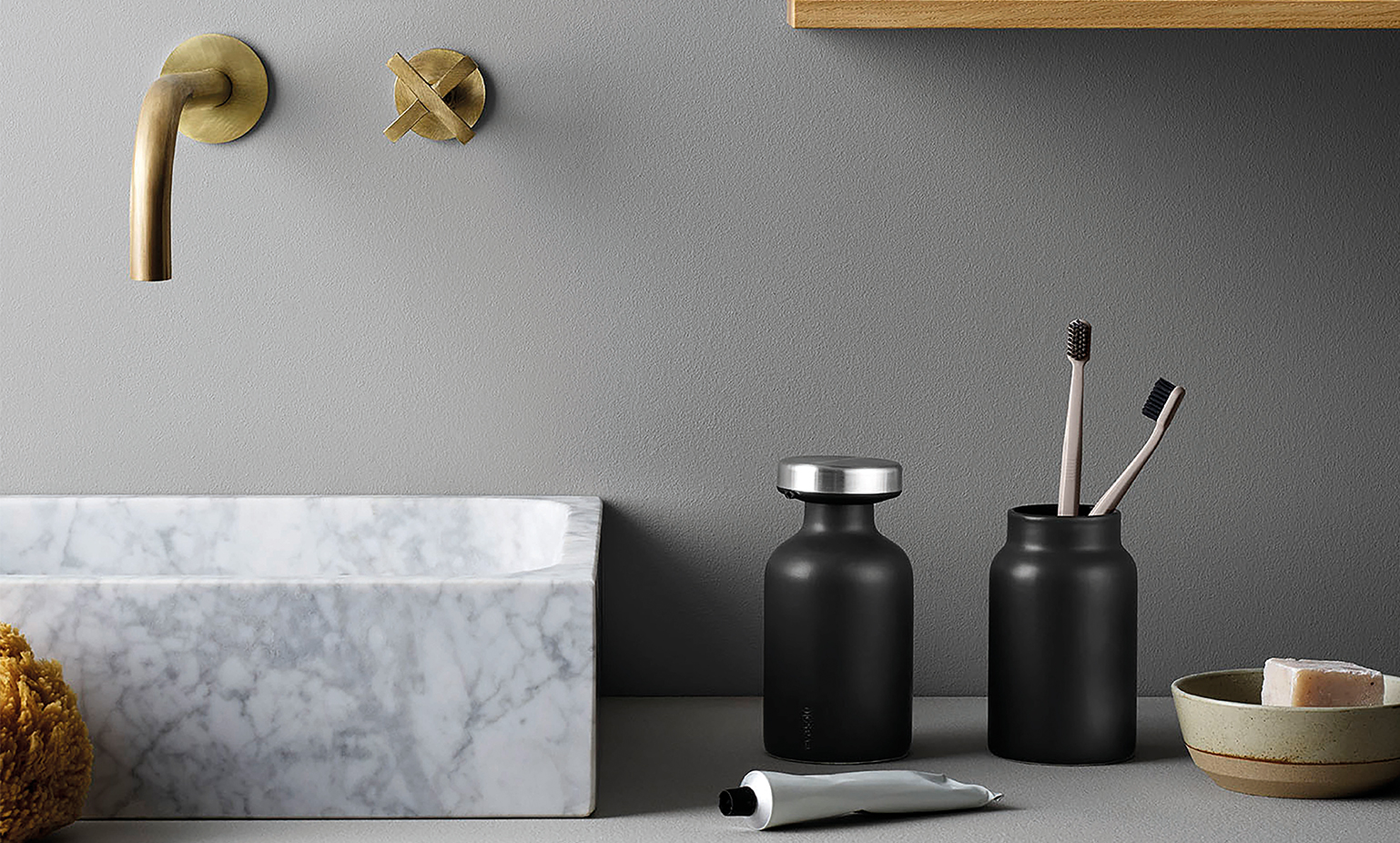 Met de zeepdispenser en tandenborstelhouder van LAUFEN blijft jouw badkamer altijd georganiseerd én elegant.