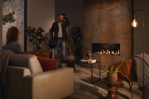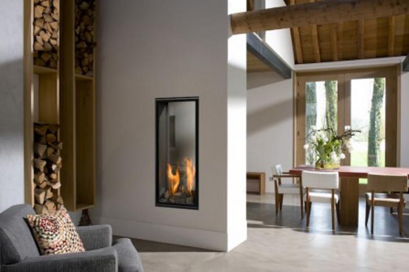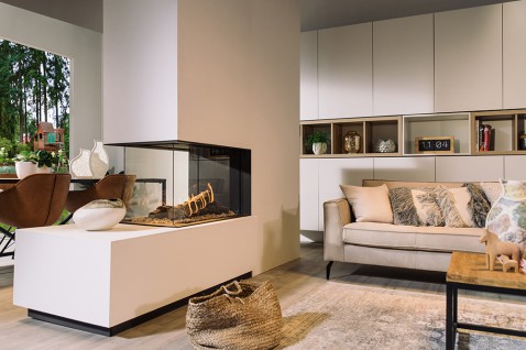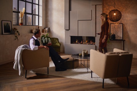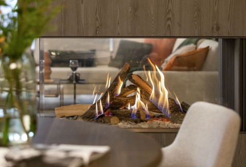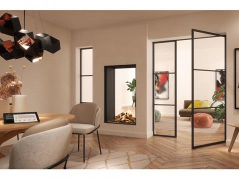 Een perfect zicht op het ultieme vuur met de Dru Maestro 75 Tunnel Eco Wave. Ideaal als roomdivider.