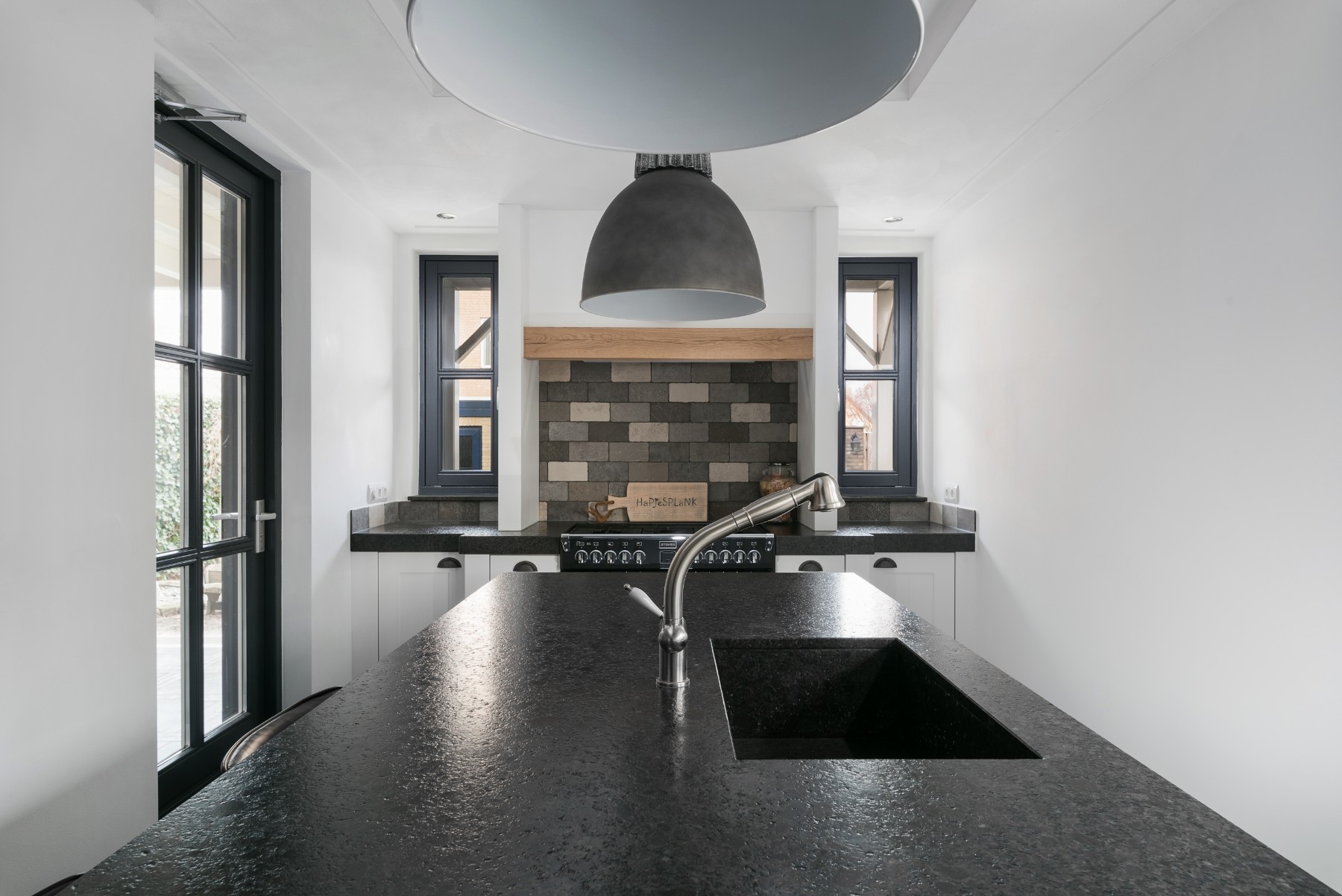 Een 'volle' keuken van RestyleXL: granieten werkblad, grote STEEL oven, wijnkoelkast, haard, de nieuwste Quooker Black en nog meer.