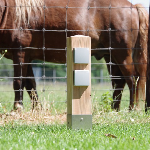 Houten oplaadpaal met een Wallbox erin verwerkt