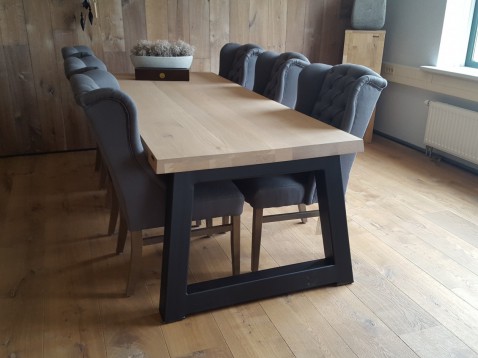 Stoere industriële eettafel op Maat. Industriële tafel met Rustiek Eiken tafelblad en metalen Trapeze poot. Bezoek Showroom HoekbankXXL in Buurmalsen.