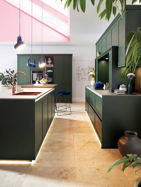 Wat een blikvanger, deze keuken! Het lichte groene kookeiland zorgt voor een frisse en vrolijke sfeer.