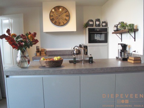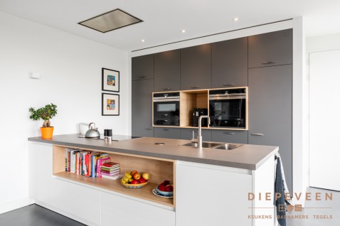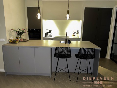 Agaatgrijze greeploze Tieleman-keuken (model Schuller Fino Matt) met Atag en Bora apparatuur, Dekker multiplex aanrechtbladen en een Quooker keukenkraan.