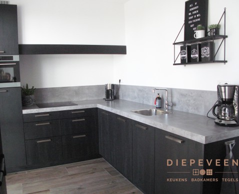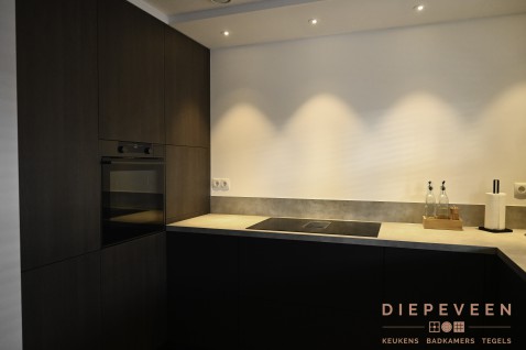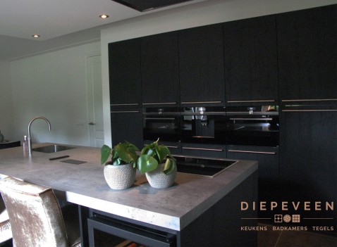 Deze greeploze Schüller keuken is een keuken die uitgevoerd is in staal brons imitatie. Een frontkleur die perfect past bij zwart.