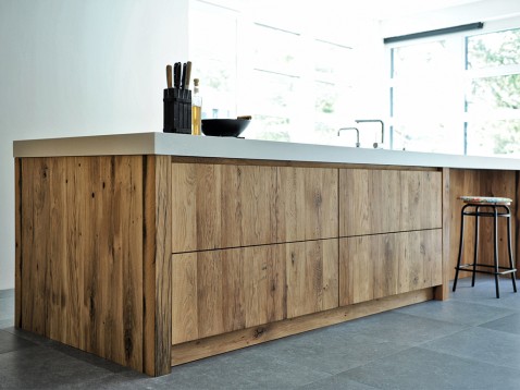 Verweerd hout, stoere details en kwaliteitsmaterialen maken van deze keuken een duurzame leefruimte