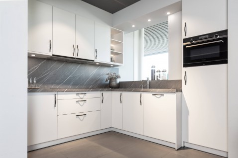 De Keller Black Marble is een nieuw model uit de keukencollectie van Keller Keukens. Een moderne keuken met matgelakte fronten in de kleur sneeuw.
