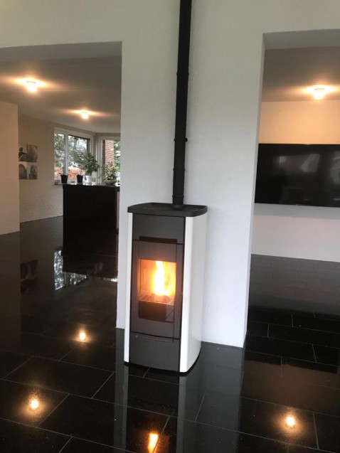 Prachtige ronde pelletkachel met zeer hoog rendement.