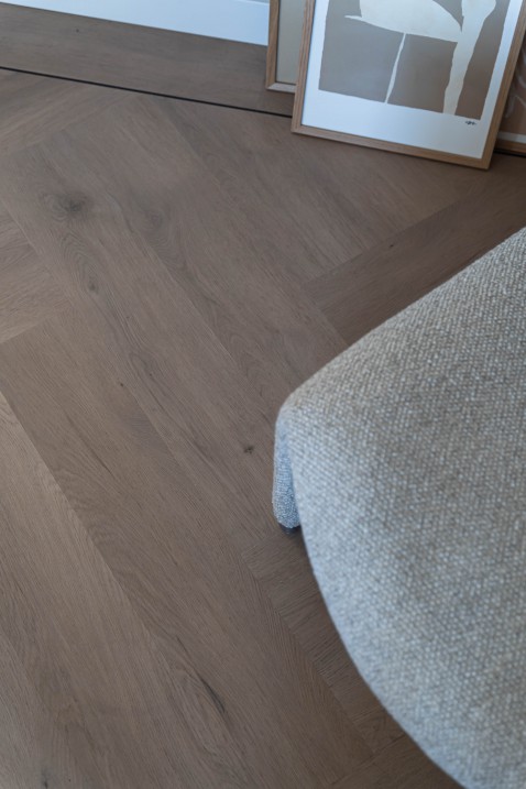 De gedurfde knopen en kleurschakeringen van de Parquetvinyl Mantaro geven deze PVC-vloer een natuurlijke en realistische look. Het visgraatmotief voegt een elegante finesse toe. (Foto: Bert Demasure)