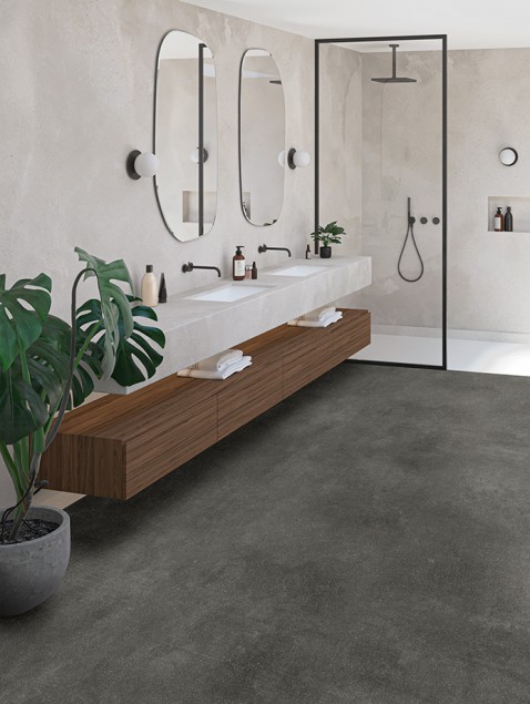 De Caldera collectie combineert de stoere uitstraling van polybeton met het onderhoudsgemak van een waterbestendige PVC-vloer.