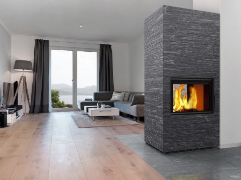 Deze lichtere speksteenkachel biedt een zeer mooi zicht op het vuur en houdt de warmte voor langere tijd vast.