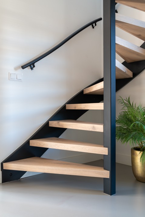 Prachtige stalen spiltrap met staalplaten balustrade en eiken treden en stootborden