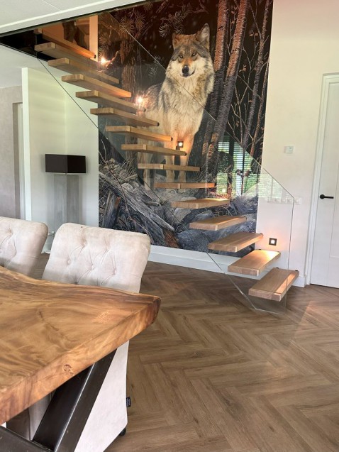 De houten treden zijn zwevend bevestigd tussen muur en glazen trapboom. De glazen panelen zijn afgewerkt met een RVS leuning op het glas.