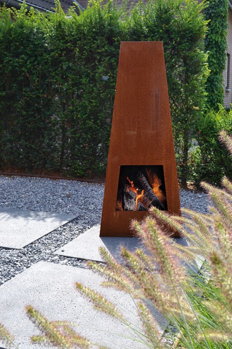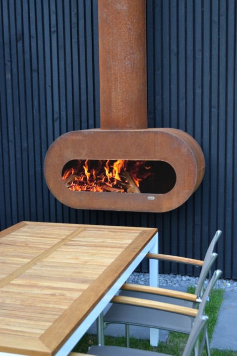 De tuinhaard model by dens 300 is uiteraard gemaakt van het duurzame Cortenstaal en voorzien van een dubbele achterwand zodat die niet te heet wordt.