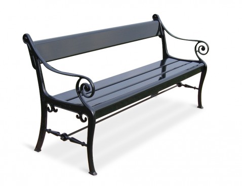 Een majestueuze parkbank in gietaluminium en hardhout, geïnspireerd op een Deens 19e-eeuws ontwerp
