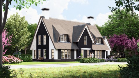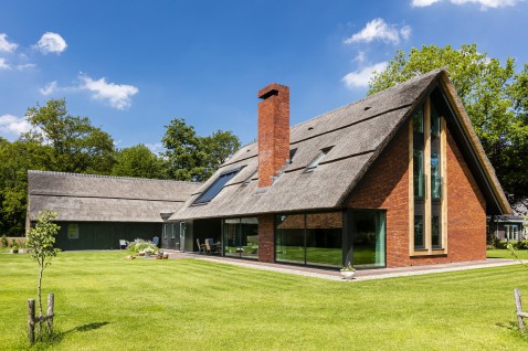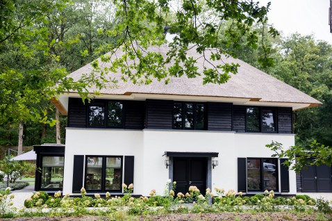 Deze royale woning in landelijke, moderne stijl wordt gekenmerkt door het rieten dak, wit gesauste gevels en verticale zwarte geveldelen.