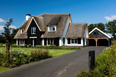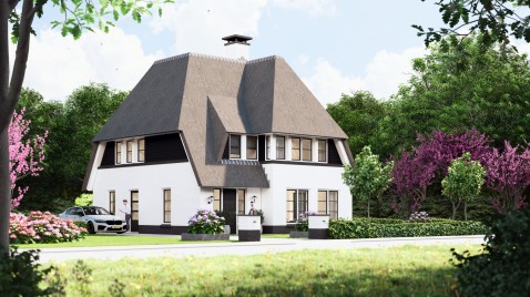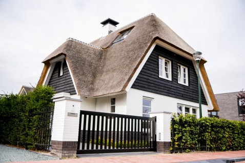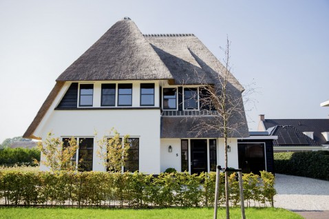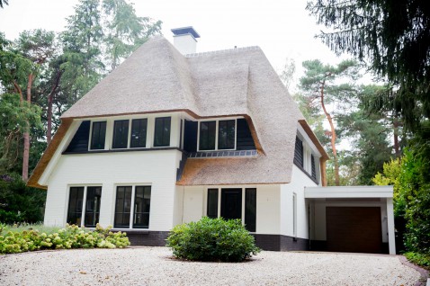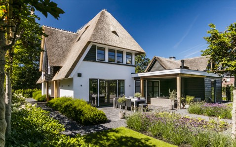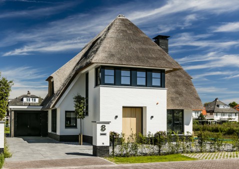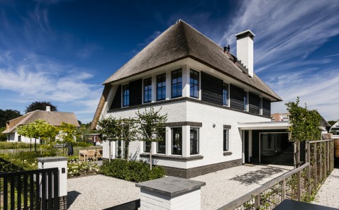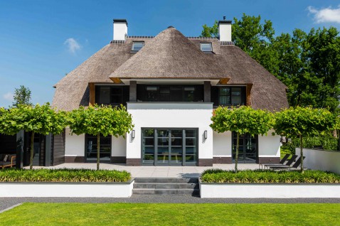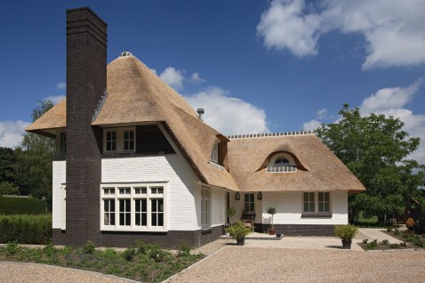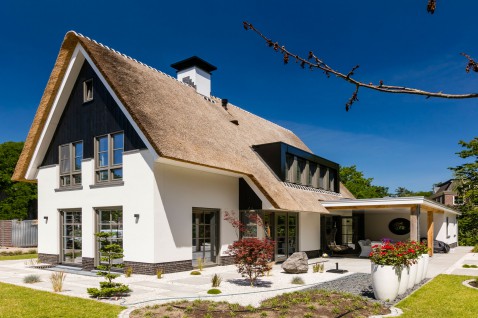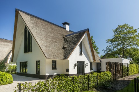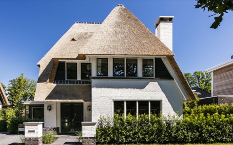 Een royale rietgedekte villa met asymmetrische kap te Aerdenhout, wit gekeimd, modern uitgevoerd