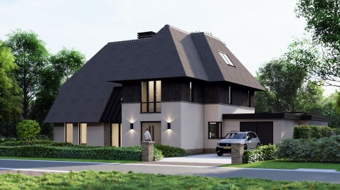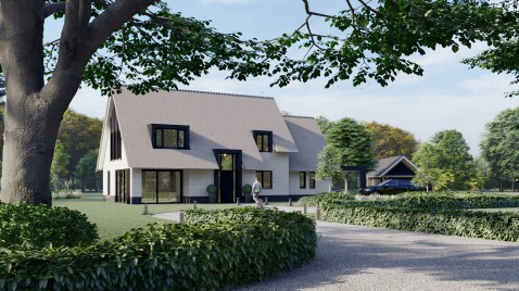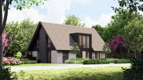 Op een royale kavel is deze villa gerealiseerd met een chique steen en riet als dakbedekking.