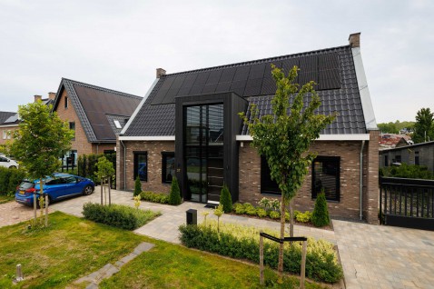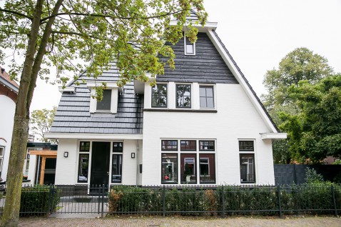 Een stijlvol, statig en modern herenhuis! De strakke gestukadoorde buitengevels, donkere kozijnen, en vlakke dakpannen zorgen voor stoere uitstraling.
