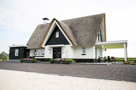 Een rietgedekt landhuis met een wel heel bijzondere kap! De combinatie van witte gevels en houten potdekselwerk geven het landhuis een stoere uitstraling.