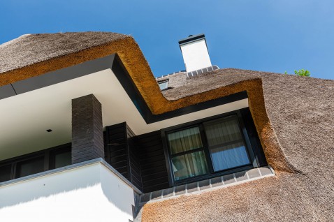Een rietgedekte hoogbouw villa met een eigentijdse uitstraling, in een Z-vorm, net even anders dan een traditionele rietgedekte villa