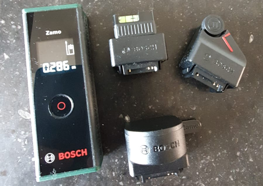 Bij het eerste gebruik is toch nog heel even zoeken. Voornamelijk welke informatie zie ik en hoe werken de verschillende adapters precies. Dit is echter vrij snel duidelijk. Wel moest ik even zoeken hoe het met de oppervlaktemeting zat. Met een paar keer proberen kwam ik hier al vrij snel achter (gewoon twee keer op het knopje drukken, dan kom je in de oppervlakte-modus). Ik had een nog aantal klusjes liggen dus ik kon het mooi testen. Er moesten drie kastjes in onze woonkamer opgehangen worden. En dat boven elkaar, dus daar kwam wat rekenwerk bij kijken. Een mooie gelegenheid om de Zamo eens goed te testen. Het resultaat? Ik kan niet anders zeggen dan dat het ideaal is. Geen onhandig gedoe meer met meetlint of iets dergelijks. Je ziet gelijk in je display de getallen die je nodig hebt. Met de laserlijn kon ik bovendien perfect alles waterpas ophangen! Omdat we binnenkort op vakantie gaan, moest ik ook nog de handbagage-koffers opmeten. Hiervoor heb ik de 'wieladapter' gebruikt, ook hier ben ik erg enthousiast over. Je 'rijdt' met het wieltje over de koffer en je weet de afmetingen.