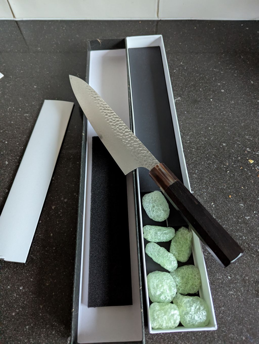 Zoals bij denk ik vrijwel alle Japanse messen vraagt ook dit model om wat aandacht. Het mes kan niet in de vaatwasser en je moet het na gebruik even met de hand afspoelen en drogen. Ook is het belangrijk om voorzichtig te zijn met harde ingrediënten zoals botten of bevroren producten, om beschadigingen te voorkomen. Ik heb deze koksmes nog maar pas maar ik heb gelezen dat het mes, bij normaal gebruik, lang scherp blijft en dus minder vaak geslepen hoeft te worden.