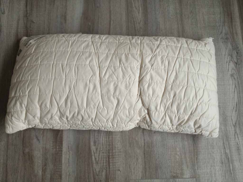 Wat in eerste instantie opvalt, is dat het kussen vrij smal oogt. Het formaat (40x80) is volgens mij niet zo gangbaar in Nederland. Ik ben dan ook heel benieuwd hoe dit ligt. Het is handgemaakt in Duitsland heb ik gelezen, dus dat belooft (denk ik) veel goeds. Overigens passen mijn kussenslopen er wel gewoon goed omheen, dus dat is gelukkig geen probleem.