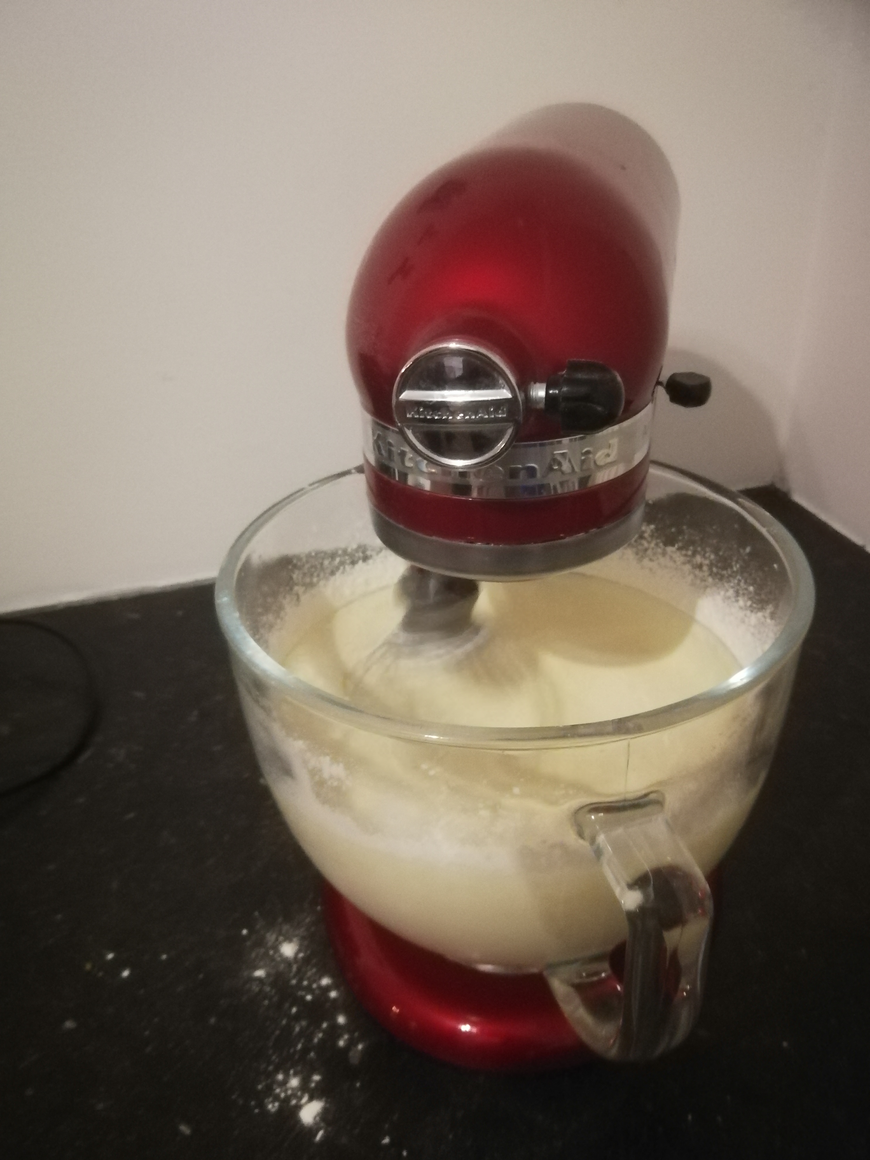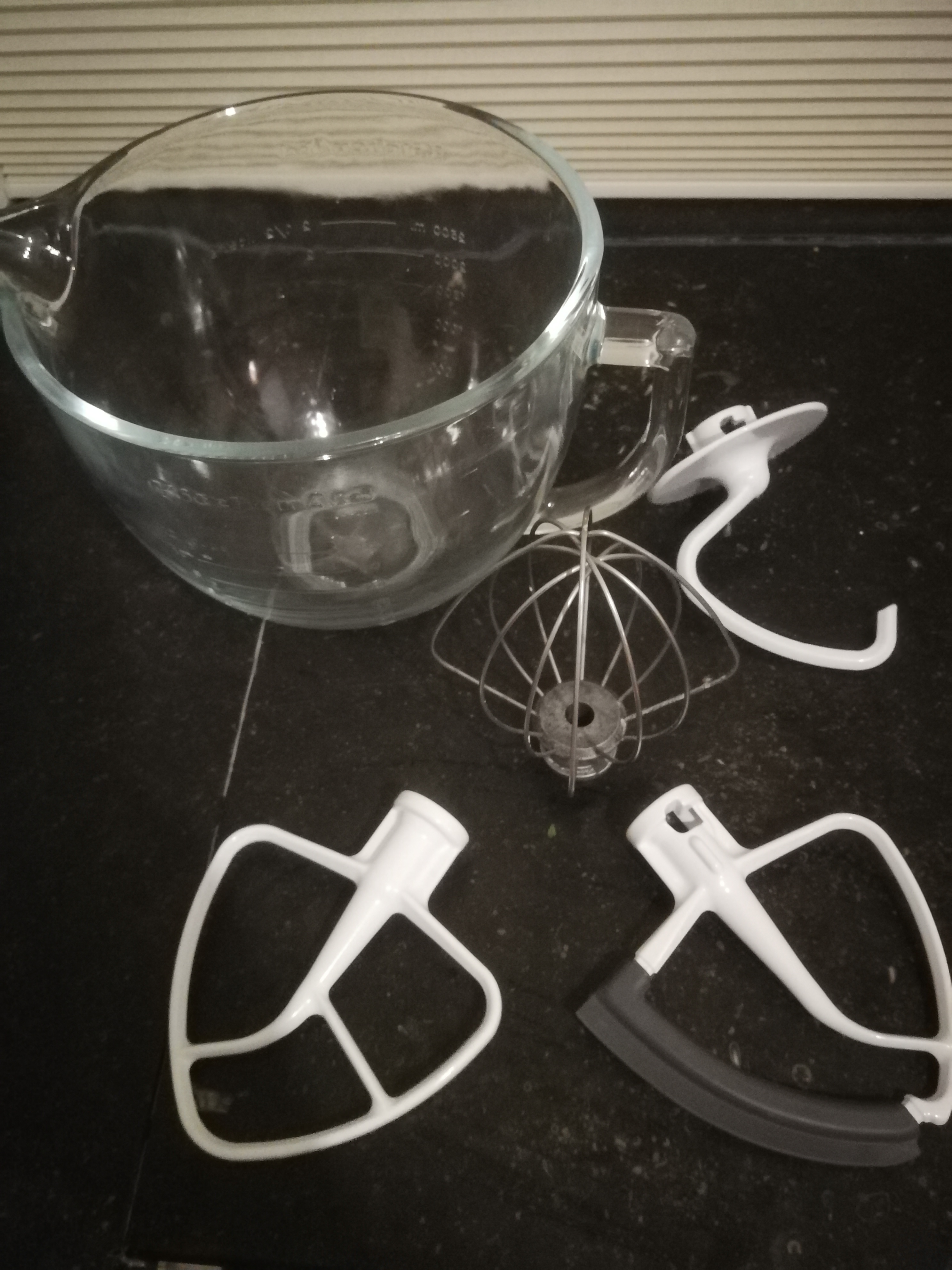 Om het apparaat uit de doos te krijgen moet je goed je best doen, maar je krijgt dan ook waar voor je geld. Op het aanrecht staat hij met zijn rode kleur prachtig te stralen. Aansluiten is eenvoudig. Je stopt de stekker in het stopcontact en we kunnen aan de slag. De meegeleverde accessoires hebben even een sopje nodig, maar zijn daarna klaar voor gebruik. Ik heb een uitgebreide versie gekregen met meerdere haken en kommen. De eerste weken heb ik van alles uitgeprobeerd met de machine, het is even wennen om te werken met een machine met zoveel kracht. De flexbeater is wel mijn favoriet als het gaat om beslag maken. De menghaak komt goed langs de kom en zo hoef je niet steeds de motor uit te zetten om met de hand nog na te mengen. Met de garde kan je snel ook kleine hoeveelheden opkloppen, zelfs een beker slagroom lukte in een handomdraai. Over de deeghaak ben ik helaas minder te spreken. Het lukt niet goed om een goed brooddeeg te kneden. Het deeg blijft vaak rondjes draaien in plaats van dat het gekneed wordt. Een voordeel van de KitchenAid t.a.v. mijn oude machine is dat je de hoogte van de accessoires eenvoudig kan afstellen waardoor je niet een laag aan de onderkant krijgt die je er later nog doorheen moet mengen.