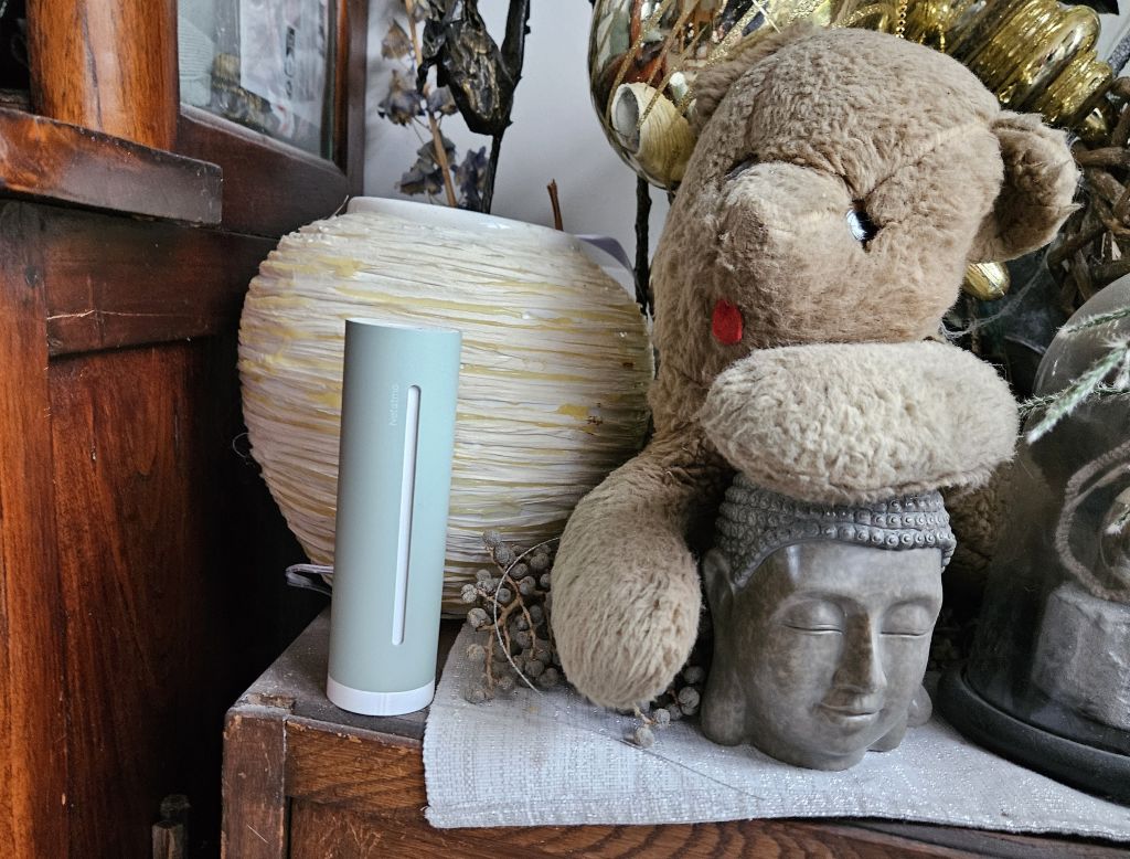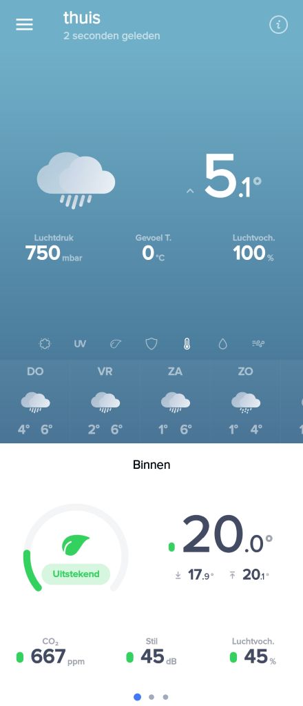 Het Netatmo weerstation ziet er eigenlijk meer uit als een strak designobject dan als een typisch weerstation. De modules zijn smalle, ronde buisjes van mat aluminium met een klein wit randje onderaan. Geen schermpjes, geen knopjes, geen drukke cijfers: het staat gewoon netjes op een kast of plank zonder op te vallen. Binnen heb je een wat hoger buisje, buiten een iets kleiner exemplaar. Ik heb een mintgroen versie en valt net wat meer op als designitem. Je bedient alles via de app op je telefoon. Op het apparaat zelf zie je alleen een lichtje bovenop: als je erop tikt, geeft een gekleurde ring aan hoe goed de luchtkwaliteit binnen is. Zo blijft het er minimalistisch uitzien, maar heb je toch in één oogopslag een idee of de lucht nog oké is. Kort gezegd: het is een weerstation dat expres zo ontworpen is dat het niet “technisch” oogt, maar rustig, modern en passend bij een normaal interieur.