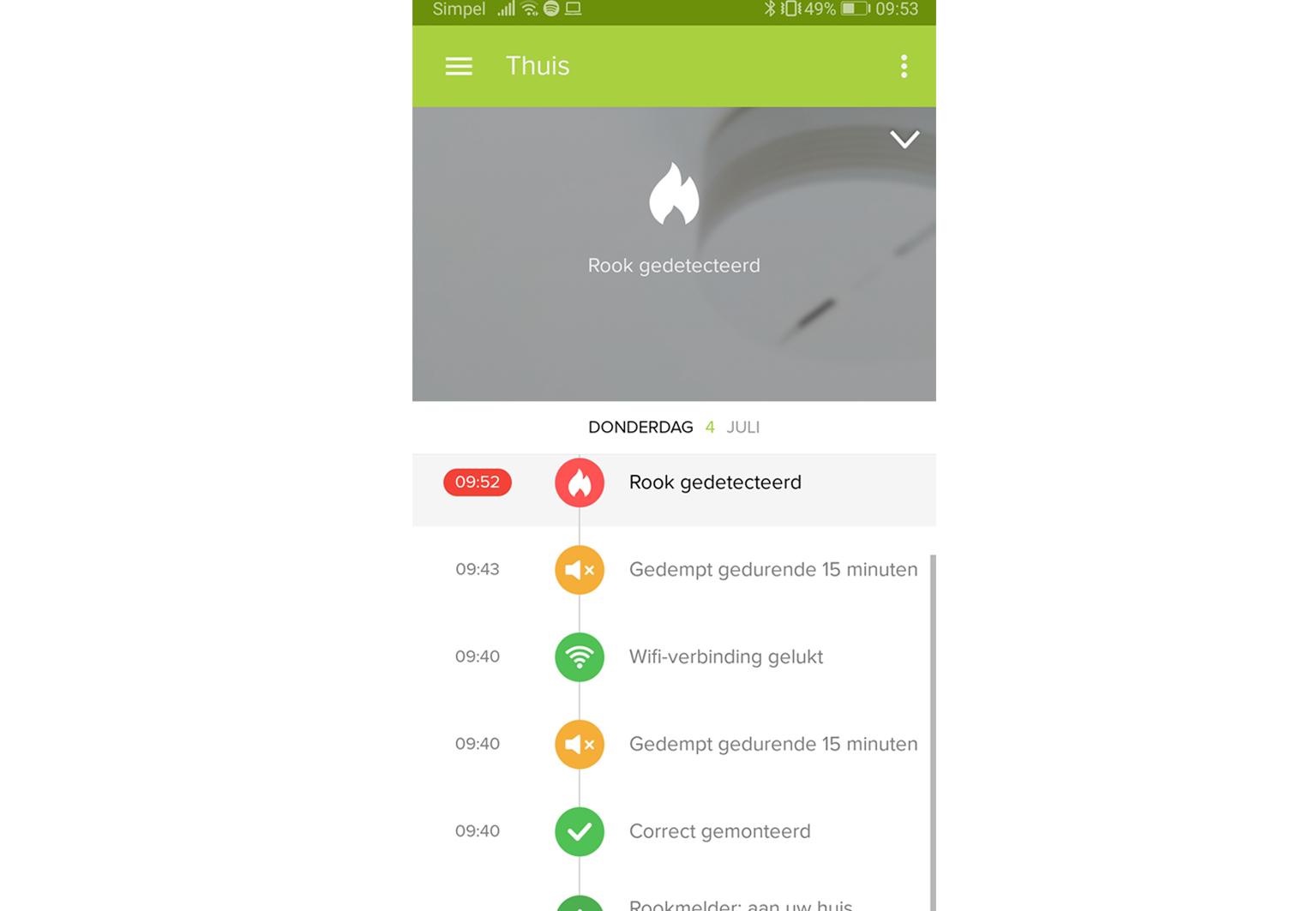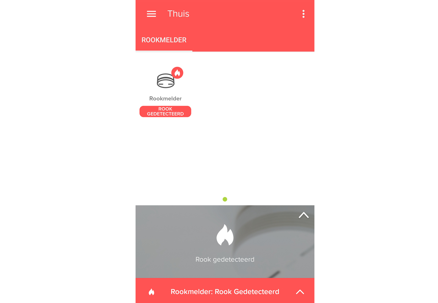 Zodra de Netatmo Slimme Rookmelder rook detecteert gaat het alarm meteen aan. Ook krijg je een melding op je telefoon en zodra je die opent kleurt de app ook rood (als er niets aan de hand is is de app groen.