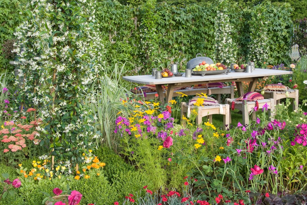 De vrolijke tuintrend ‘Viva La Vida’ draait om het vieren van het leven vol passie en kleur. Het warme kleurenpalet van onder meer roze, rood, oranje en geel zorgt voor een subtiele tropische en mediterrane sfeer. Tuinmeubels van hout of gevlochten riet worden gecombineerd met kleurrijke tuinkussens met franjes en kwasten. Je eigen tuin wordt zo een zomers vakantieparadijs waar je even kunt ontsnappen uit de drukte en zorgen van alledag maar net zo goed een feestje kunt geven. Gezellig met vrienden en familie aan een lange eettafel. De beplanting zorgt daarbij voor een intieme sfeer en rondfladderende vlinders en zoemende bijen verhogen het zomergevoel: Viva la Vida!