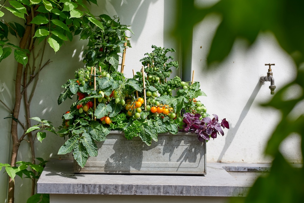 Wie in de zomer wil genieten, denkt natuurlijk ook aan heerlijk eten. Zet daarom behalve bloeiende ook eetbare planten op het terras. Tomaten (Solanum lycopersicum) en paprika’s (Capsicum annuum) hoef je niet zelf te zaaien, want bij het tuincentrum staan ze kant en klaar met de eerste vruchten er al aan. Zet de planten op een zonnig plekje en geef ze regelmatig water want je wilt natuurlijk wel sappige vruchten plukken. Bij het bereiden van mediterrane gerechten zijn kruiden als rozemarijn, salie en tijm onmisbaar. Omdat deze planten vorstbestendig zijn, kun je ze ook in de volle grond zetten.