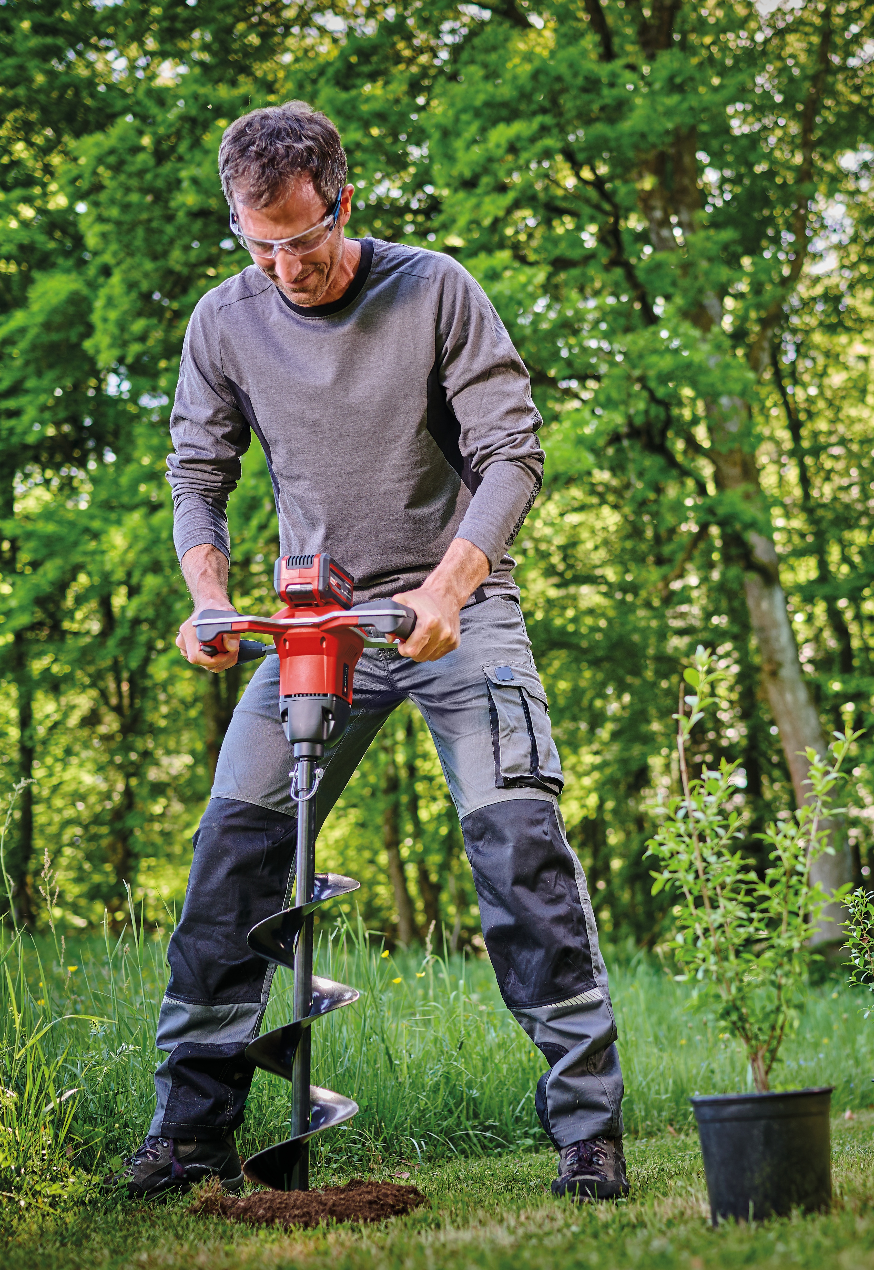 Een grondboor is handige hulp voor het graven van plantgaten voor bomen en struiken, het plaatsen van (schutting)palen en voor het verbeteren van de afwatering van de tuin. Einhell presenteert een grondboor die werkt op een krachtige 18V-accu. Daarmee maak je eenvoudig een (plant)gat van 15 cm doorsnee en kun je tot 80 cm diep gaan. Je houdt de machine vast aan beide handgrepen en… boren maar. Dat gebeurt rechtsdraaiend. Voor zachte bodems gebruik je de ECO-stand. Met HIGH-power boor je eenvoudig in een harde ondergrond. Door de knop ‘linksdraaiend’ in te drukken, haal je de boor eenvoudig uit de grond. Softgrip op de handgrepen zorgt voor comfortabel werken. De grondboor is te vervangen door een mengstaaf (niet meegeleverd) voor het mengen van verf of mortel. De Einhell grondboor is verkrijgbaar voor € 205,95 (excl. accu en lader).