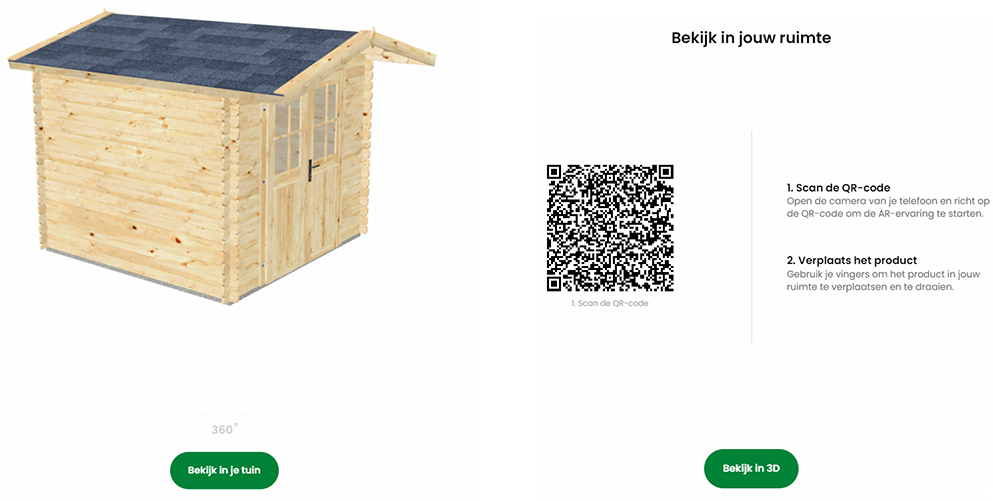 Wat onze 3D-ervaring nog meer bijzonder maakt, is de mogelijkheid om gebruik te maken van Augmented Reality (AR). Deze nieuwe functie stelt je in staat om onze producten virtueel in je eigen tuin te plaatsen. Met een paar tikken op je smartphone of tablet kun je bijvoorbeeld zien hoe een blokhut past in de hoek van je tuin, of hoe een nieuwe tuinset eruitziet op je terras. Dankzij de AR-functie komen de producten tot leven en zie je precies hoe ze passen in jouw ruimte.