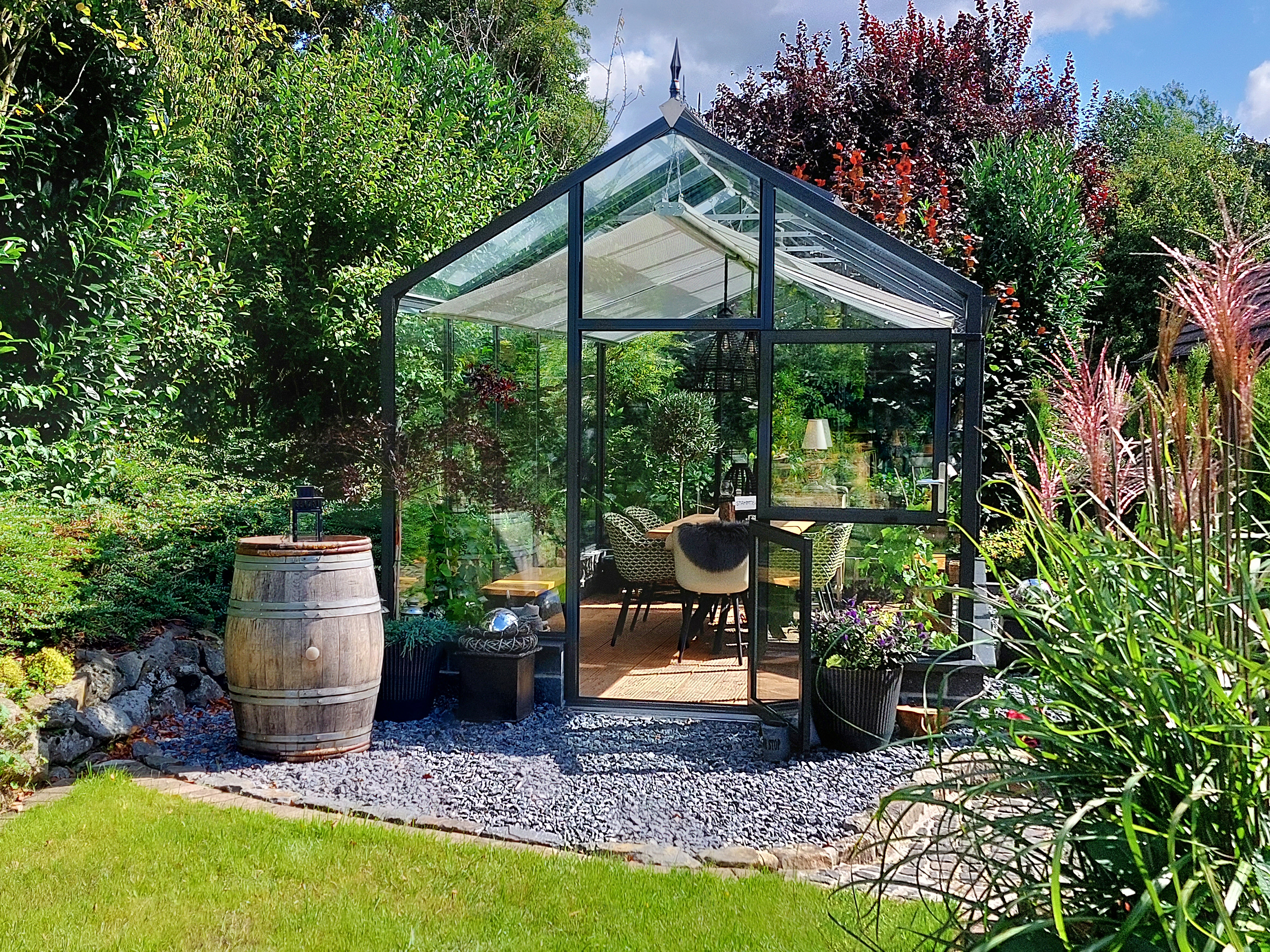 De Bio-Top biedt een aangenaam klimaat voor planten én gebruikers. De ramen en deuren worden grotendeels voorgemonteerd geleverd en kunnen worden aangepast aan persoonlijke wensen. Er is keuze uit enkele of dubbele deuren, extra dakramen en verschillende kleuren. Regenwater kan via ingebouwde goten worden opgevangen en gebruikt voor het bewateren van de planten. Dankzij de royale hoogte en het lichte ontwerp is de Bio-Top bovendien niet alleen geschikt om in te kweken, maar ook als buitenkamer. Met een kleine zithoek of tuintafel verandert de kas in een comfortabele plek om te ontspannen, te lezen of te genieten van het buitengevoel – ongeacht het seizoen.