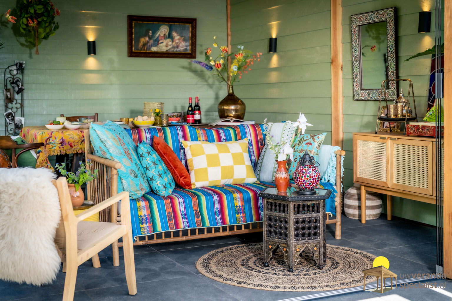 Nu de basis schoon is, kun je de veranda helemaal naar jouw smaak inrichten. Kies kleuren waar je blij van wordt! Of je nu gaat voor een levendige, kleurrijke uitstraling of juist een rustige, natuurlijke sfeer, alles is mogelijk. Denk aan stijlen zoals Marrakech, Urban Jungle of Bohemian Ibiza, of stem de veranda af op de stijl van je woning voor een mooi geheel.