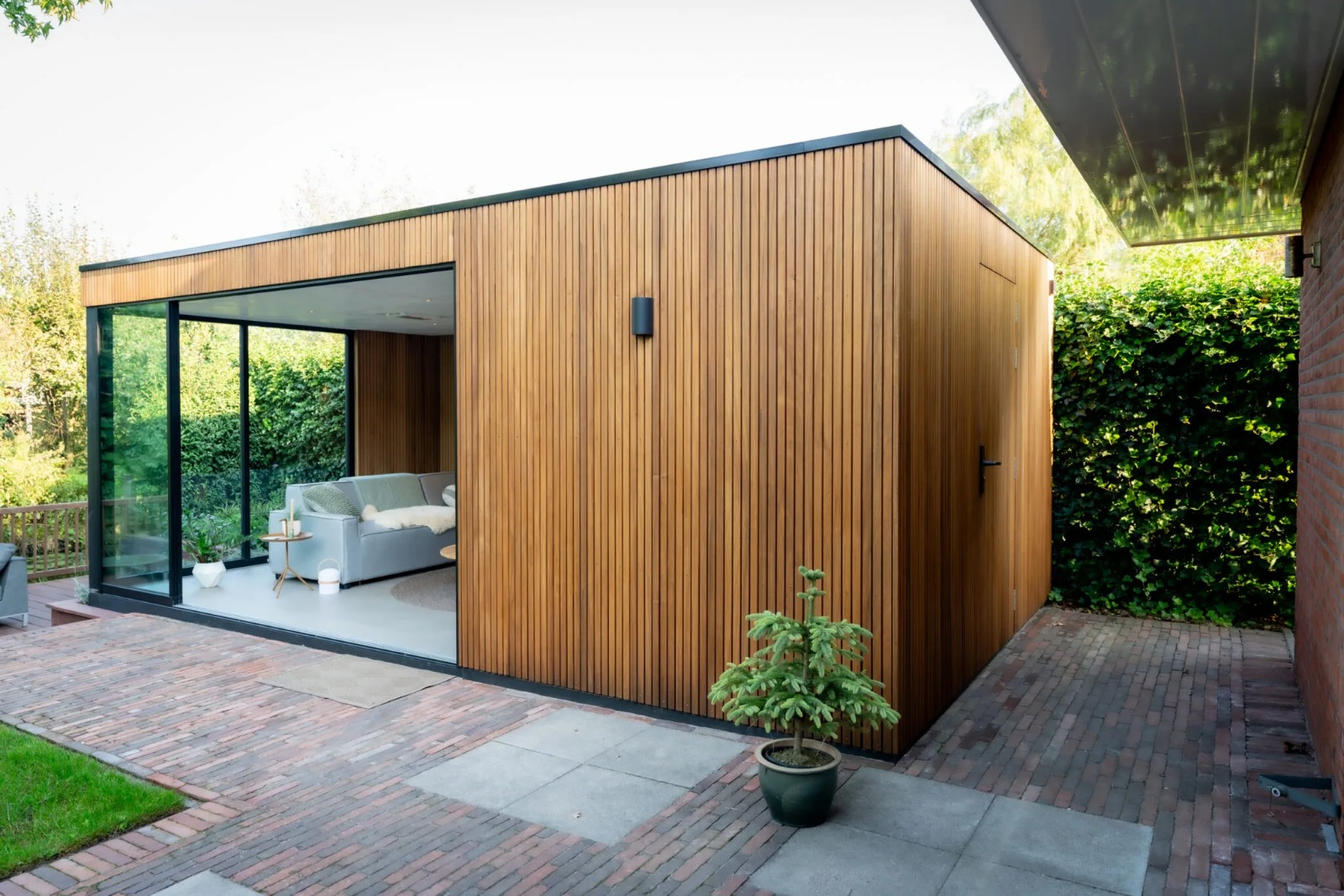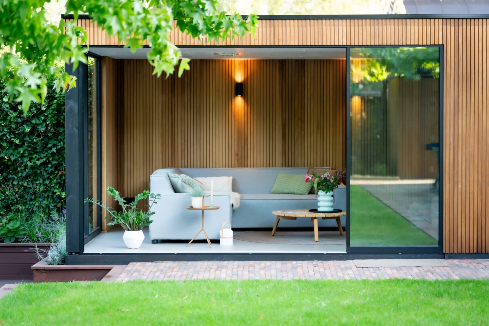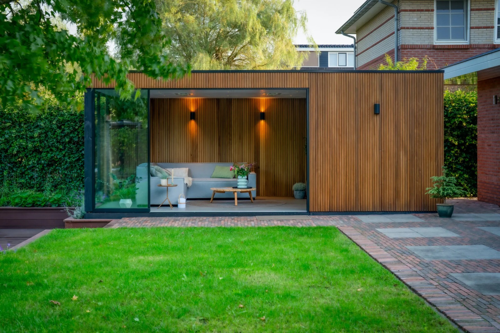 Lara: ‘We hebben inmiddels al drie seizoenen in de tuinkamer meegemaakt. Het is echt genieten. Zowel mijn man en ik als onze dochter Bo maken intensief gebruik van het Scandinavische huisje in de tuin. Vooral als je er aan het eind van de middag zit en de bladeren van de amberbomen het licht prachtig filteren. Dan is het echt genieten. Maar ook ’s avonds als we de buitenverlichting aan hebben ziet het er ontzettend knus en gezellig uit.’