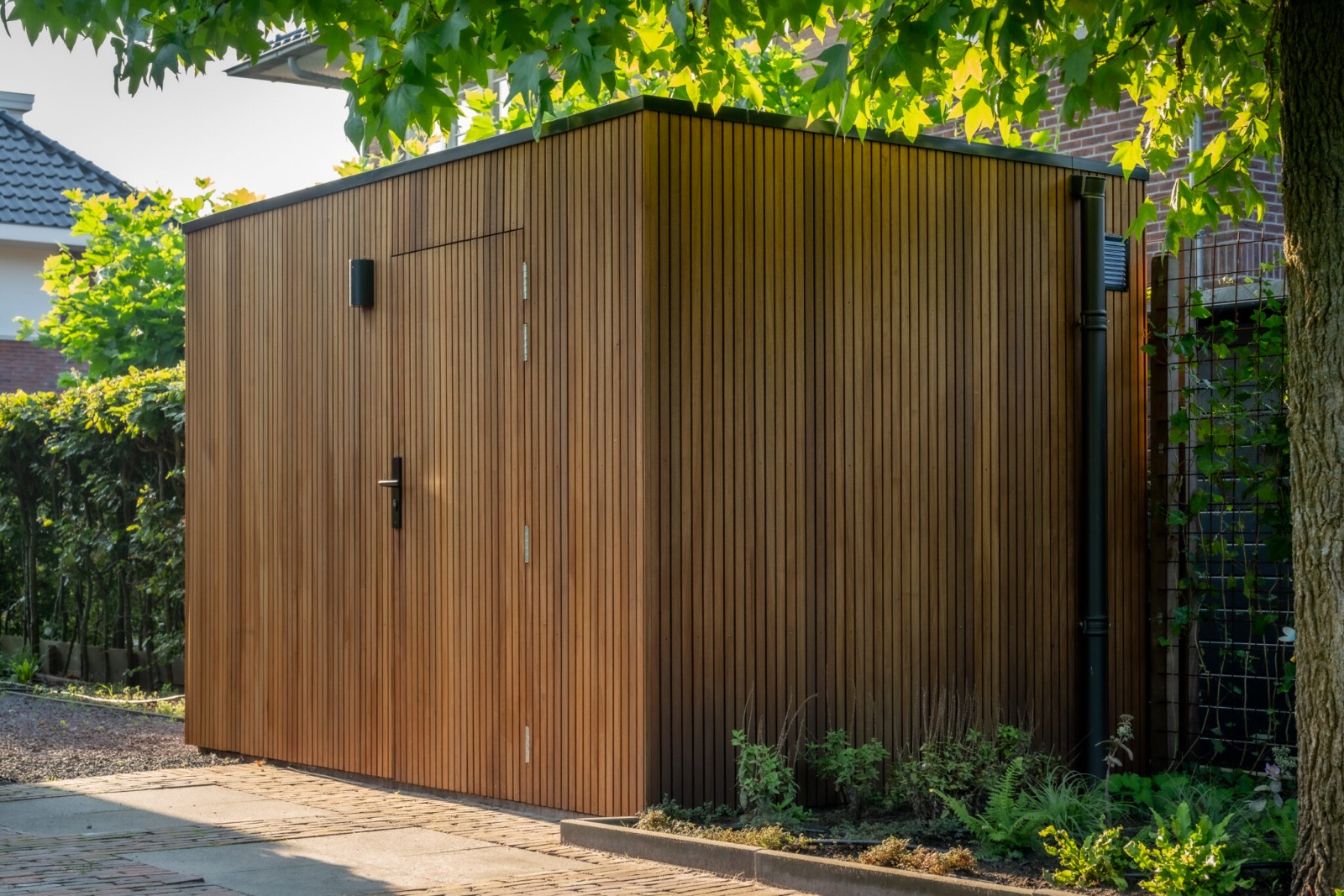 Chiel: ‘We wilden iets neer laten zetten van goede kwaliteit, wat jaren meegaat. Op een goede stevige fundering. Ferry gaf ons gelijk vertrouwen toen hij vertelde over de sterke fundering middels grondankers. Hij beantwoordde al onze vragen en dacht in deze beginfase vooral mee over de optimale indeling. We kozen voor een kleine berging grenzend aan de tuinkamer en een op zichzelf staande, royale berging aan de andere kant van de tuin. De beide gebouwen vormen wel één geheel, omdat ze beide aan de buitenzijde zijn afgewerkt met de strakke Rhombus delen.’