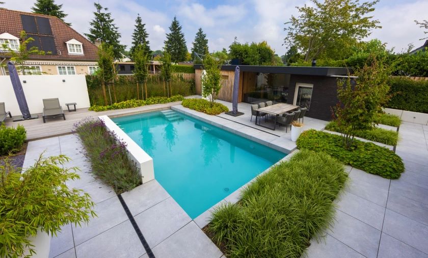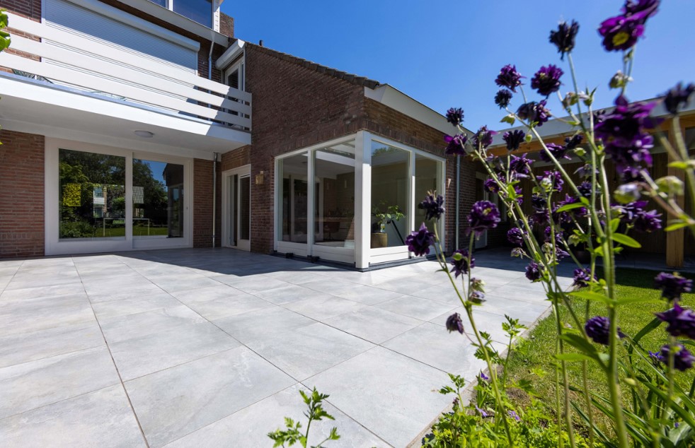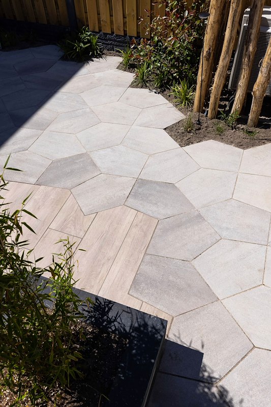 In deze tuin zijn twee soorten terrastegels gecombineerd. De Geostretto Alivo is in de vorm van een looppad gelegd.