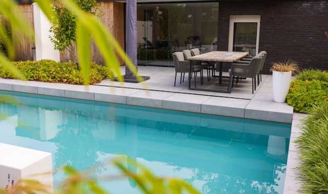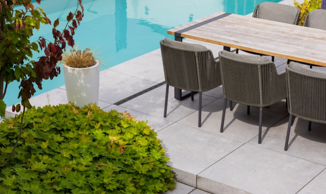 GeoCeramica® tegels zorgen voor een harmonieuze uitstraling in de tuin, met een naadloos en rustig ontwerp voor terras, trapelementen en zwembadranden.