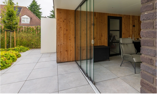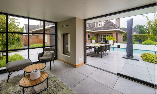 Het gebruik van tegels in dezelfde stijl zowel binnen als buiten zorgt voor een harmonieuze en rustige sfeer in de leefruimte.