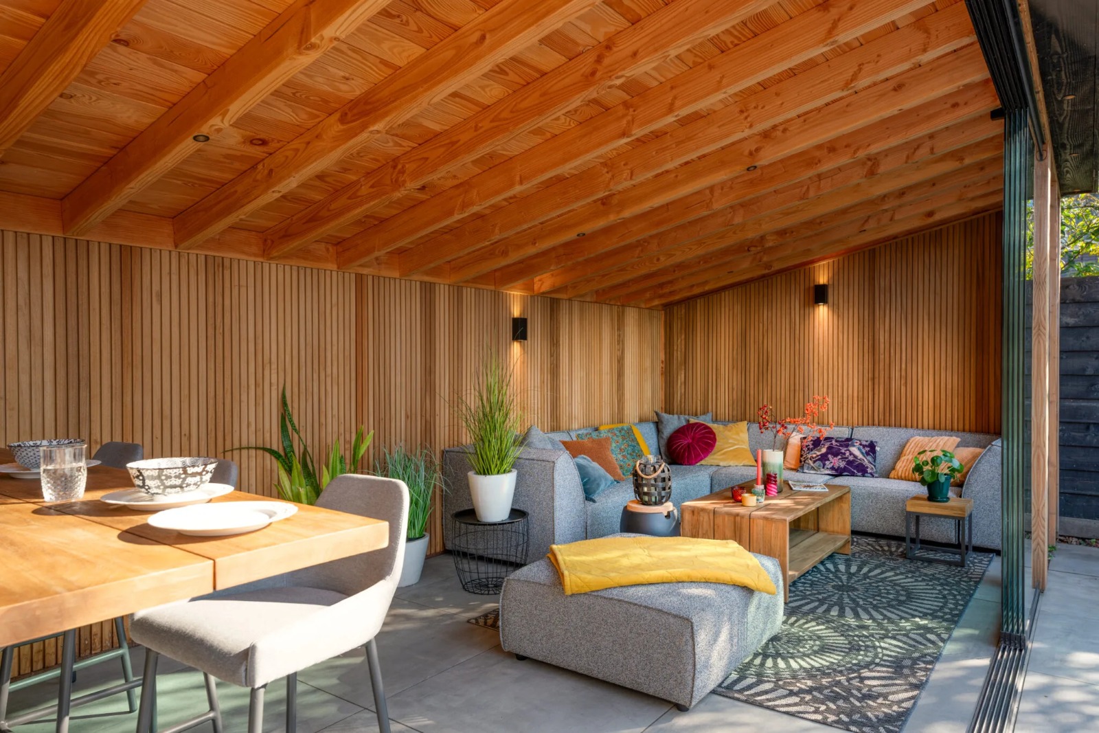 Ellemieke: ‘We wonen hier met onze zonen die inmiddels 16, 18 en 20 jaar zijn. Hun vrienden komen geregeld over de vloer dus extra leefruimte werd een must. Arjan kwam met het idee om achter het huis een overkapping te laten plaatsen. In eerste instantie speciaal voor onze jongens, zodat wij onze woonkamer weer ‘terug’ zouden krijgen. Nu er een mooie bank in staat, een mooie hoge eettafel en er langzaam wat meer accessoires in komen vind ik hem eigenlijk te mooi voor de jongelui en zitten Arjan en ik er ook heel graag.’