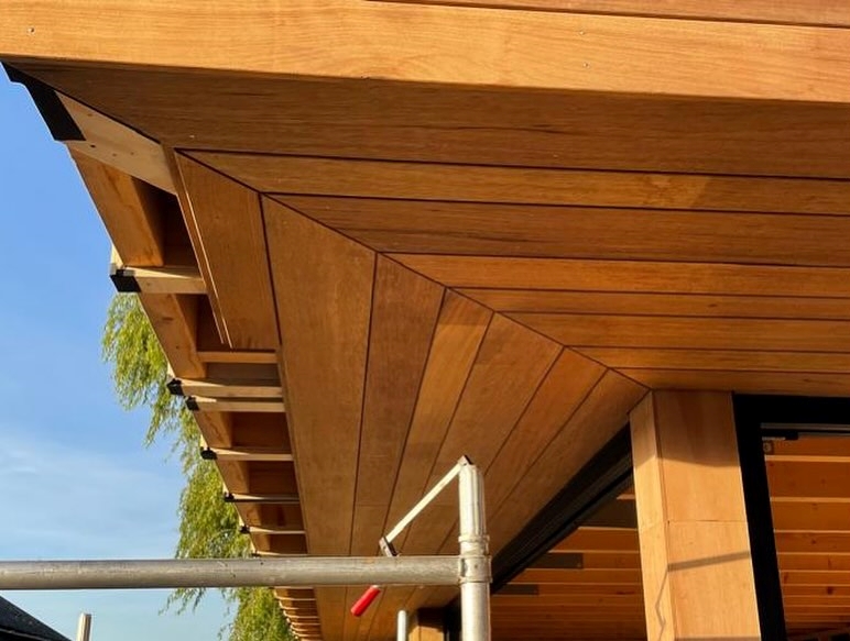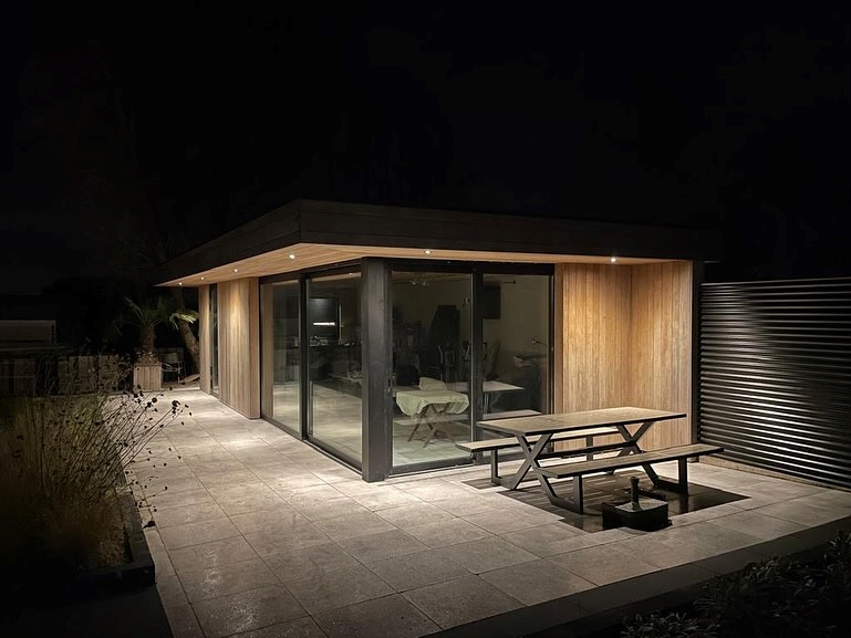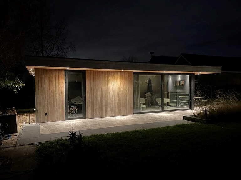 Tuinhuis van 4,5 x 10 meter uitgevoerd in Fraké met aluminium kozijnen in Hardinxveld-Giessendam.